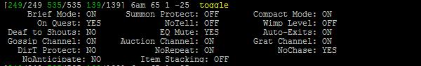 The toggle settings display is the closest thing to reviewing your JediMUD gameplay "preferences." Toggle works on a character by character basis, so you'll need to configure the settings for each of your characters separately.