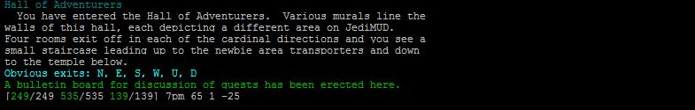 When you login to the game, if you're a level one character, you'll be placed just upstairs from the standard Midgaard hometown start location, The Temple Altar. By placing level one newbies in the Hall of Adventurers (1s of the Newbie Transporter Room), it was thought that you would be more likely to blunder into the Newbie Training Zones. Let's wait a few more minutes before blundering about in there.